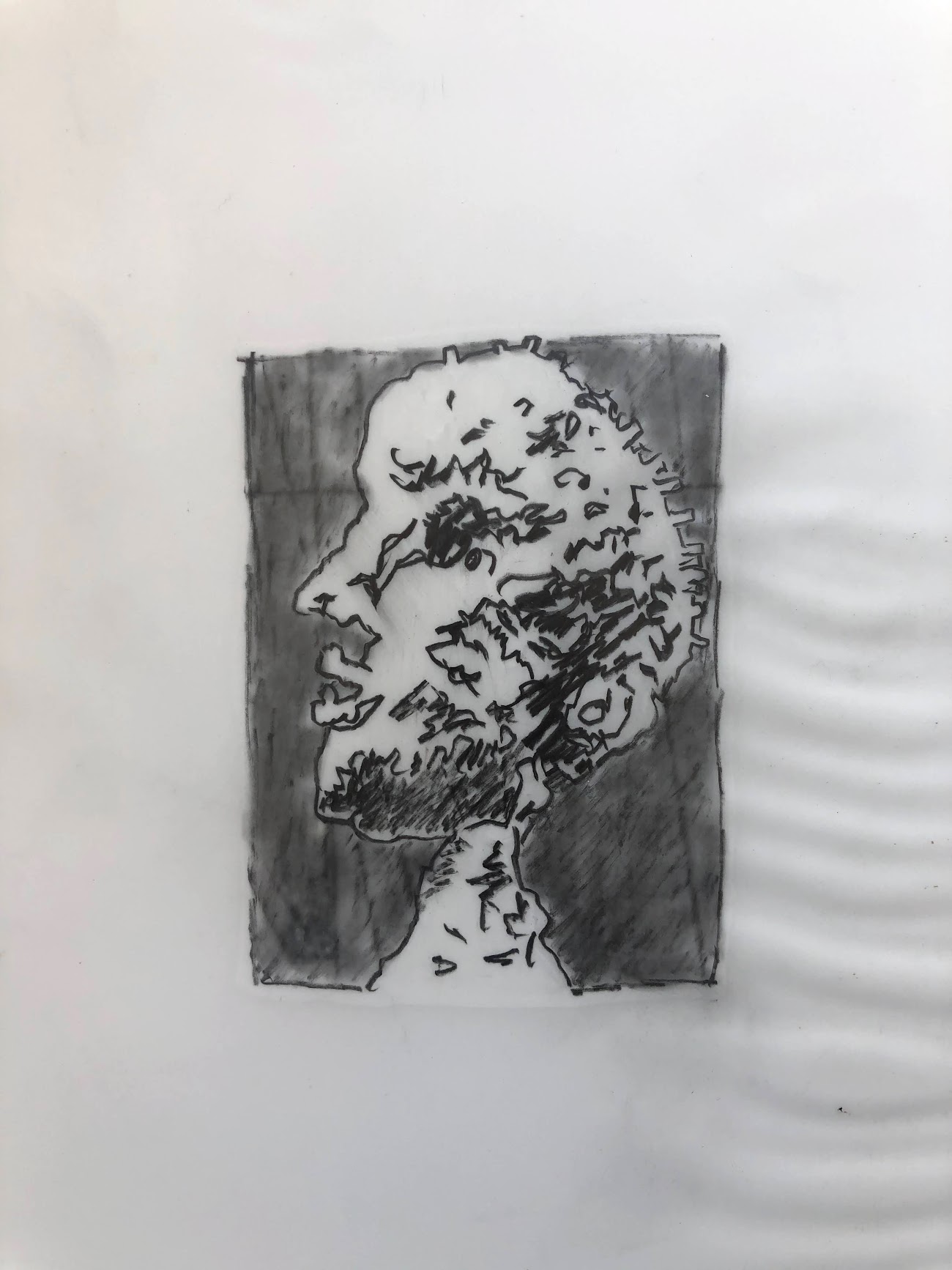 With The Rev as my in-house spiritual guide and art critic, I am heeding his chiaroscuro advice emphasizing the tonal values. It is glorious and intimidating to try to limn a likeness of these formidable figures. As I look anew at each countenance, the expressions on the sculptures seem now even more fit for these tumultuous times. Now the whole planet is in crisis. Personal pain is now political and now planetary. I am drawing as if my life depends on it and it does…